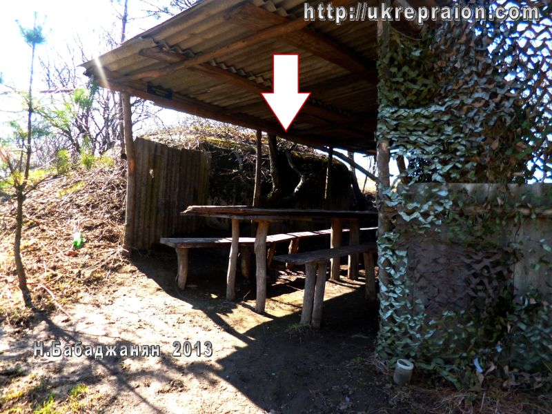Перед амбразурами, видимо «исключительно для маскировки», возведён навес со столиком и лавочками под ним, затянутые с фронта настоящей маскировочной сеткой.