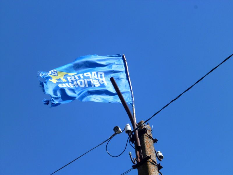Так, на столбе ЛЭП кто-то, по совершенно не понятным для меня причинам, водрузил штандарт Партии Регионов, который майорив над арендованным ставком. Истрёпанный на ветру, флаг приобрёл настоящий, закалённый в схватках боевой вид.
